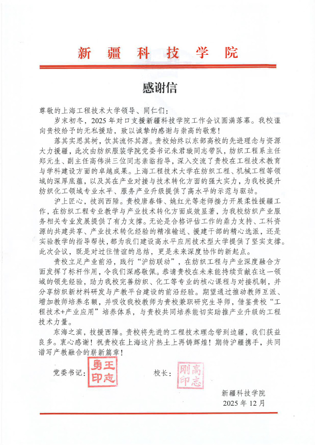 沪上匠心 技润西陲 | 新疆科技学院致信感谢我校对口支援