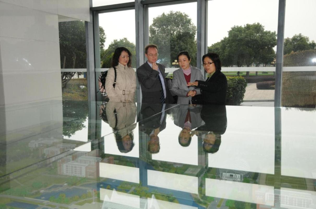 詹姆斯・柯克布雷德教授一行还在国际交流处相关人员的陪同下参观了行政楼19楼观光厅、图文信息中心、现代实训中心、艺术楼,客人们对我校的优美的校园环境和先进的教学设施给予了高度的评价。