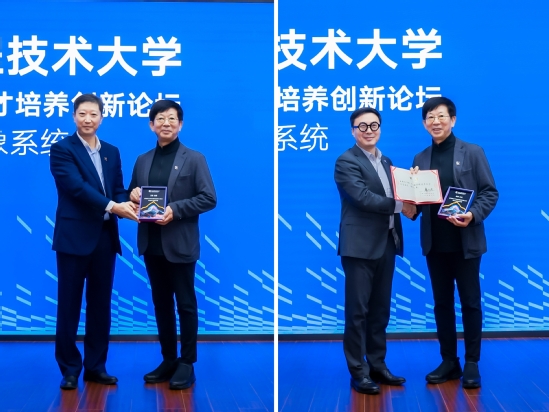 The visual identity was created by Prof. Wang Min, a renowned design scholar, doctoral supervisor at the Central Academy of Fine Arts, art director for Beijing’s Olympic bid, and former Director of Image and Landscape Art for the Beijing Olympic Games. He explained the design concept: it is based on the abbreviation “SUES,” with geometric lines form a dynamic visual symbol representing openness, integration, and progress. The 3-wings symbolizes interdisciplinary synergy and reflects SUES’ commitment to building a world-class application-innovation-university. Li Jiang and Lou Yongqi presented Prof. Wang Min with the SUES Honorary Professor certificate and a commemorative plaque.