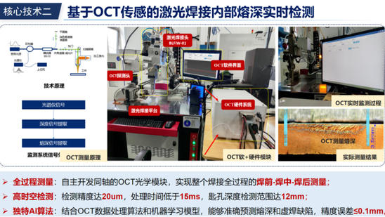 Developed a real-time penetration monitoring system based on high-precision OCT technology, enabling measurement throughout the entire welding process (pre-welding, during welding, post-welding). It achieves a detection accuracy of 20µm, processing time under 15ms, and a keyhole depth detection range of up to 12mm. By combining OCT data processing algorithms and machine learning models, it can accurately predict penetration depth and lack-of-fusion defects, with a precision error ≤ 0.1mm.
