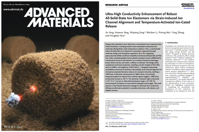 Recently, Associate Professor Song Shiqiang’s research team from SUES School of Chemistry and Chemical Engineering published their latest research findings in the internationally top-tier journal Advanced Materials, a leading publication in the field of materials science with a latest impact factor of 26.8. The paper is titled Ultra‑High Conductivity Enhancement of Robust All‑Solid‑State Ion Elastomers via Strain‑Induced Ion Channel Alignment and Temperature‑Activated Ion‑Gated Release. SUES is listed as the first affiliation, marking a major breakthrough in frontier fundamental research on advanced functional materials.