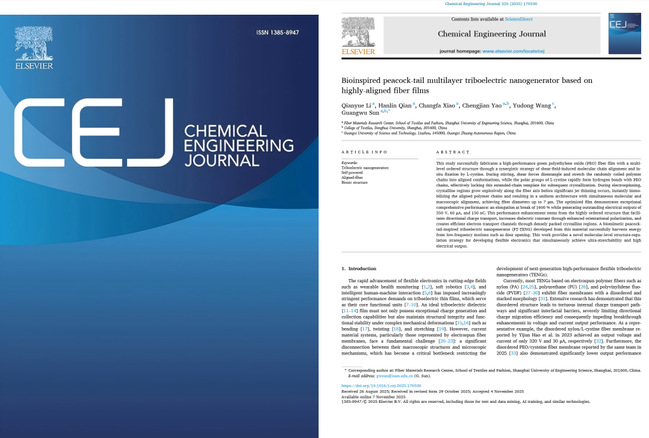 A research team led by Professor Xiao Changfa and Associate Professor Sun Guangwu (both serving as corresponding authors) from the Fiber Materials Research Center has published a paper in the top-tier journal in chemical engineering Chemical Engineering Journal (CAS Zone 1, IF=13.2). The work, supervised by the professors and conducted by postgraduate student Li Qianyue, is titled Bioinspired peacock-tail multilayer triboelectric nanogenerator based on highly-aligned fiber films.