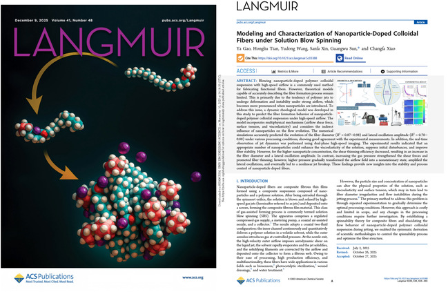 In addition, the research team also supervised postgraduate student Yang Yakun in publishing a paper titled Inverse prediction of micro-nano fiber membrane preparation process based on deep learning in Polymer (CAS Zone 2, IF=4.5), and guided postgraduate student Gao Ya in publishing a paper titled Modeling and characterization of nanoparticle-doped colloidal fibers under solution blow spinning in Langmuir (CAS Zone 2, IF=3.9).