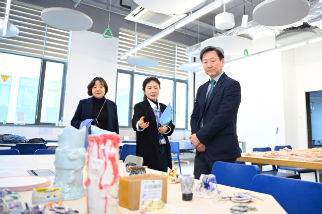 访问期间,郑胜列一行参观了我校设计学院(筹)的教学设施及相关实验室,进一步了解了我校艺术设计领域在产教融合、实践教学和创新育人方面的探索与成果。