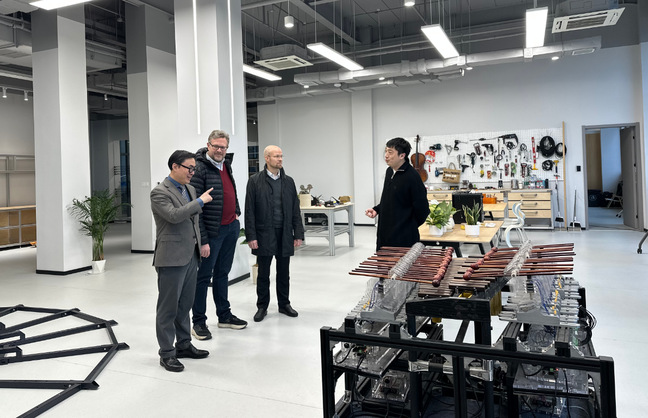 期间,访问团还参观了由陈俊恺副教授主持的“新技实验室”(Nlimited Tech Lab)。作为学校新近建成的跨学科创新平台,实验室以“工程+管理+设计”三旋翼人才培养模式为核心,推动人才培养、科研创新与创新创业改革协同发展。实验室倡导打破学科边界,以开放、循环与迭代的创新理念,构建面向未来的跨界协同育人新生态,给来访嘉宾留下深刻印象。