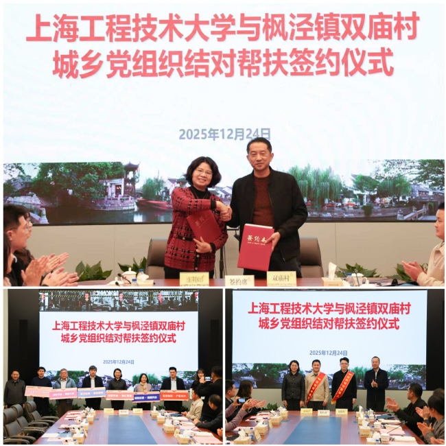 12月24日上午,中共上海工程技术大学委员会与中共上海市金山区枫泾镇双庙村总支部委员会城乡党组织结对帮扶签约仪式在金山区枫泾镇举行。上海工程技术大学党委副书记朱晓青、金山区副区长潘恩华率相关职能部门负责人出席会议。会议由枫泾镇党委副书记、镇长胡淑华主持。